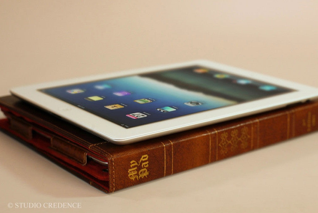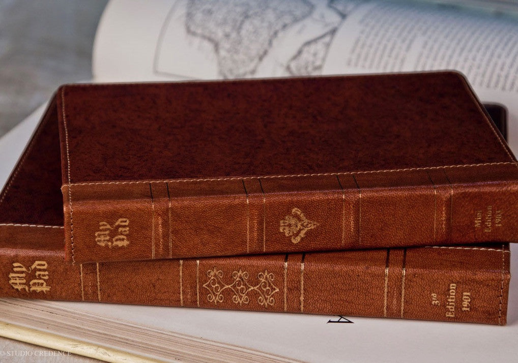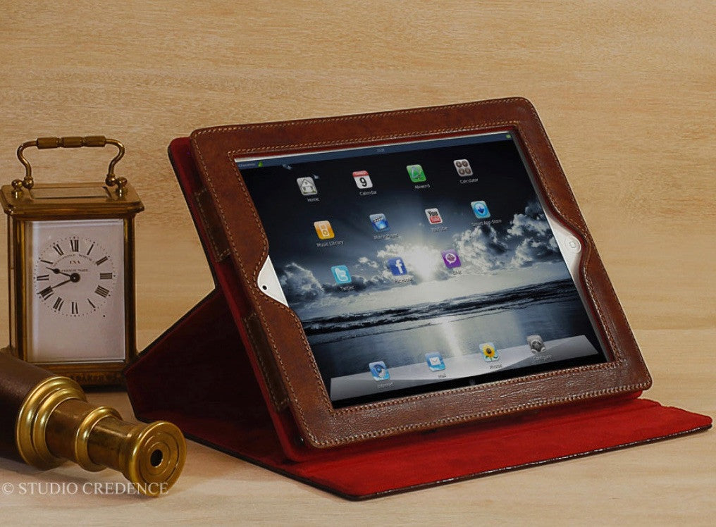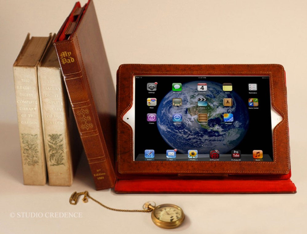 My Pad is a beautiful fusion of the vintage and the modern. Warm Chestnut hued hand antiqued leather bound book with plush red interiors awaits your priced possession the iPad. Your iPad slides and fits securely in the leather and suede padded casing. Once nested snugly inside it does not slide and all the buttons are easily accessible . The camera hole is cut precisely for the correct camera position. For easy use there are three positions to rest your iPad while using. Close it and wow, the vintage book is also a smart case with sleep/wake function securely closed with hidden magnets. The perfect companion for your iPad ….. Carry it in style.