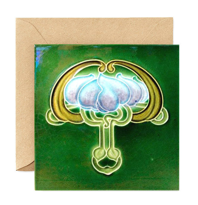 A gicleé fine art print in itself, this 4" x 4" greeting card doubles as a framable gift of an antique art nouveau tile. Craft paper envelope. Comes in a box set of 12 card-envelope sets, individually wrapped in acid-free cello bags. The box can be sold as a complete set in itself or broken up for display.