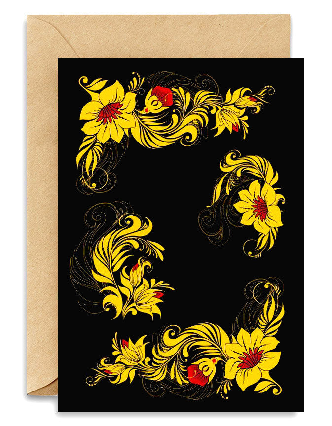 A gicleé fine art print in itself, this 5" x 7" greeting card doubles as a framable gift of a Russian textile print. Craft paper envelope, blank inside. Comes in a box set of 12 card-envelope sets, individually wrapped in acid-free cello bags. The box can be sold as a complete set in itself or broken up for display.