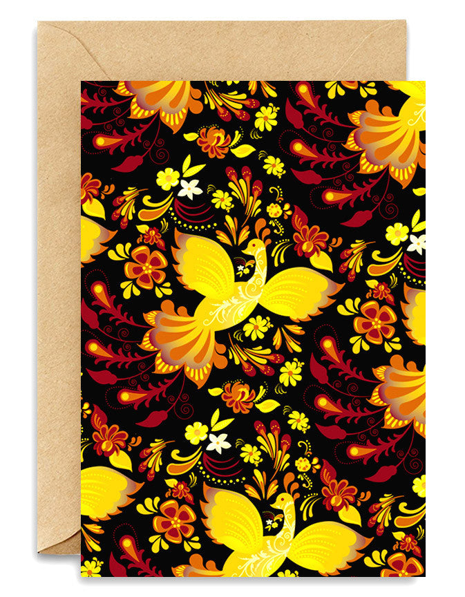 A gicleé fine art print in itself, this 5" x 7" greeting card doubles as a framable gift of a Russian textile print. Craft paper envelope, blank inside. Comes in a box set of 12 card-envelope sets, individually wrapped in acid-free cello bags. The box can be sold as a complete set in itself or broken up for display.