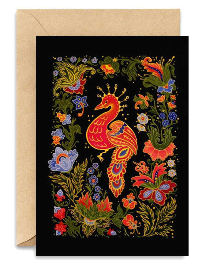 A gicleé fine art print in itself, this 5" x 7" greeting card doubles as a framable gift of a Russian textile print. Craft paper envelope, blank inside. Comes in a box set of 12 card-envelope sets, individually wrapped in acid-free cello bags. The box can be sold as a complete set in itself or broken up for display.
