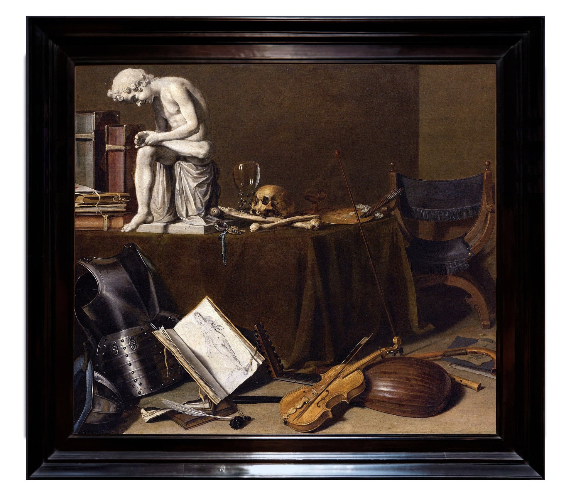 Appearances can be deceptive – certainly in painting, which gives only an impression of reality. Here Claesz presents the study materials of an educated painter: books, drawings, armour, musical instruments and a plaster cast of the Spinario, a famous antique sculpture of a boy extracting a thorn from his foot. On the table are a paintbrush and a palette, along with bones and a skull. The message is clear: the world is mere illusion and transience (vanitas).